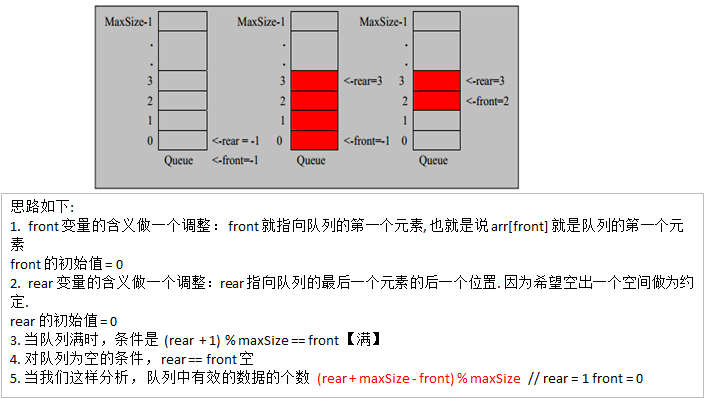 - 当空出一个元素的空间,如何判满?当还剩一个元素时,队列就已经满了,所以判断条件为 (rear + 1) % maxSize == front